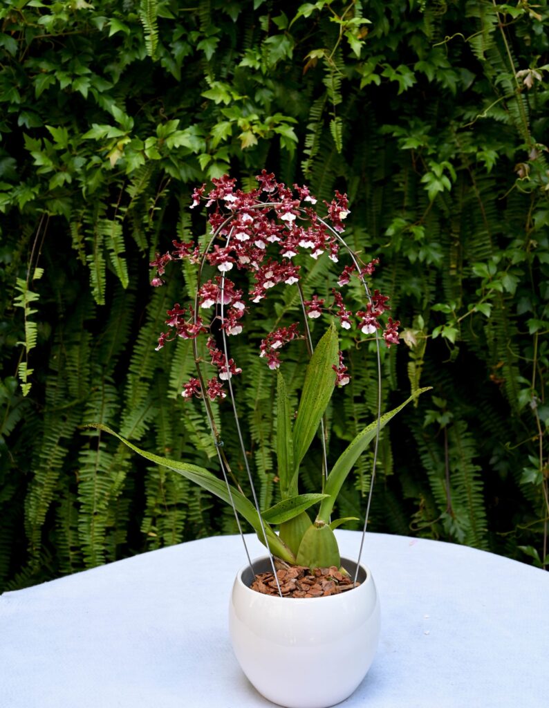 Encante seus sentidos com a exótica Orquídea Chocolate (Oncidium Sharry Baby), famosa por seu delicado perfume que lembra chocolate meio amargo com um toque floral. Suas flores em tons de vinho, marrom e branco são pequenas, mas desabrocham em abundância, formando hastes elegantes e cheias de charme.